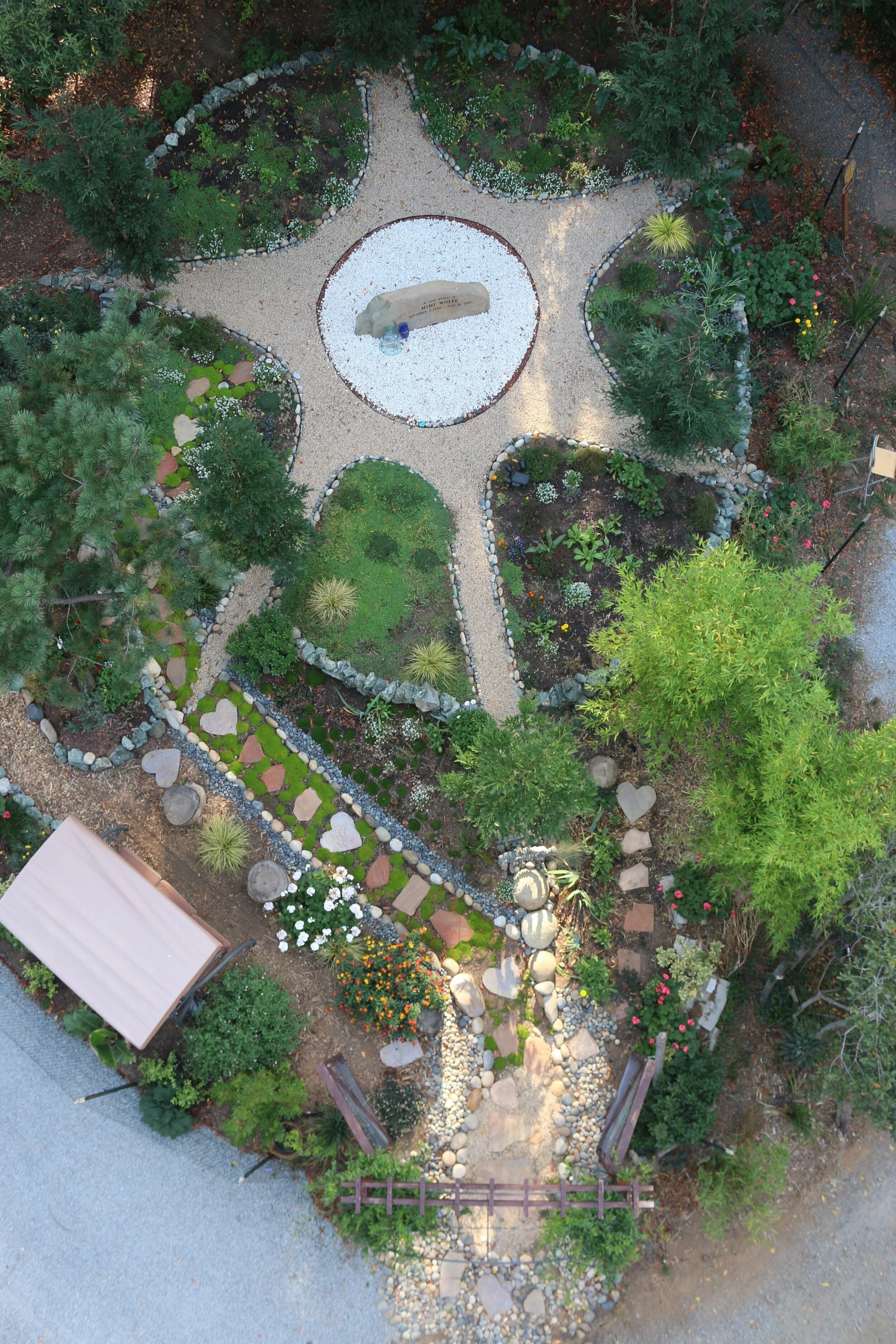The design is of a six-pointed Star of David, with a redwood tree planted near the end of each ray of the star – five of the trees stand for each member of the family of Sim’s procreation: wife, Mimi Wolfe, and three children. The sixth tree – standing for the divine source of creation – grows on the longest ray which extends outside the larger circle. A spiral path with heart-shaped stepping stones leads into the inner circle of unity. Garden design by Micah Van der Ryn. Photograph by Micah Van der Ryn.
