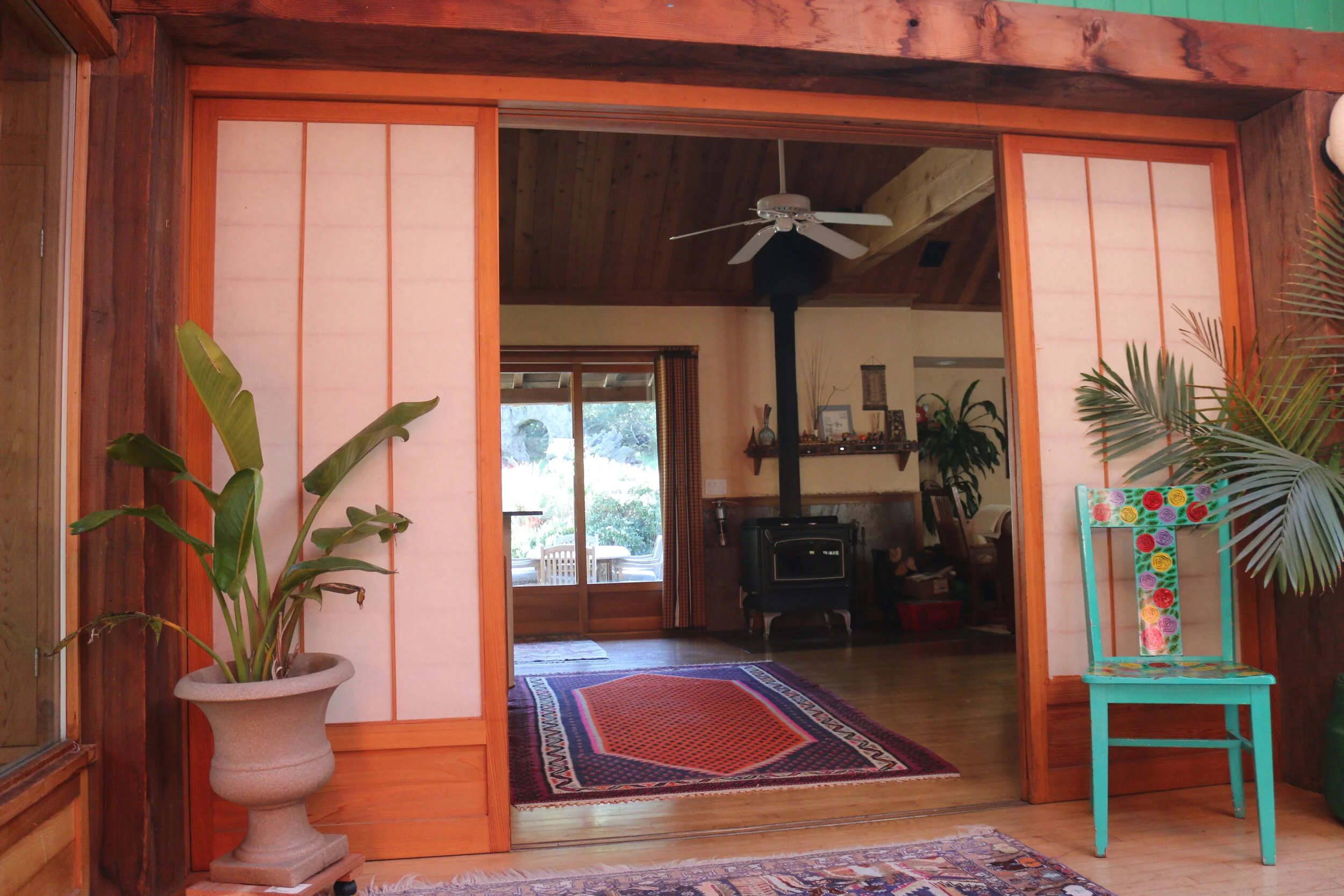 The house's formal entrance features a monumental chainsaw-carved door made of reclaimed solid redwood, all the work of the late sculptor J.B. Blunk.